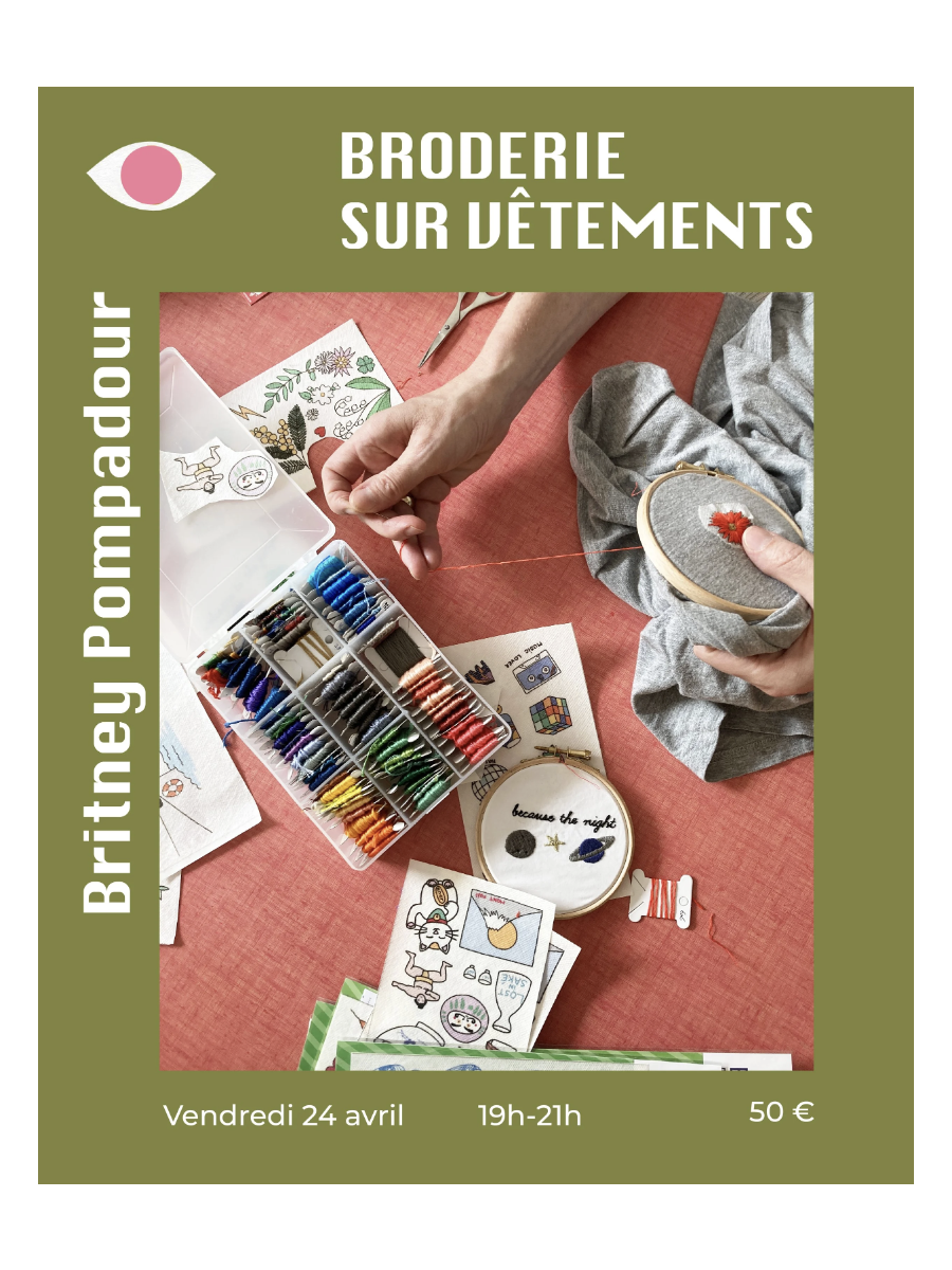 Vous serez contacté·e avant l'atelier pour savoir le mot et le motif que vous souhaitez réaliser. Apportez le tee-shirt, la chemise ou l'accessoire en tissu de votre choix on le brodera ensemble au cours de l'atelier. On se charge de vous prêter tout le reste du matériel : cercle à broder, paire de ciseaux, fil, aiguille et motif personnalisé hydrosoluble.